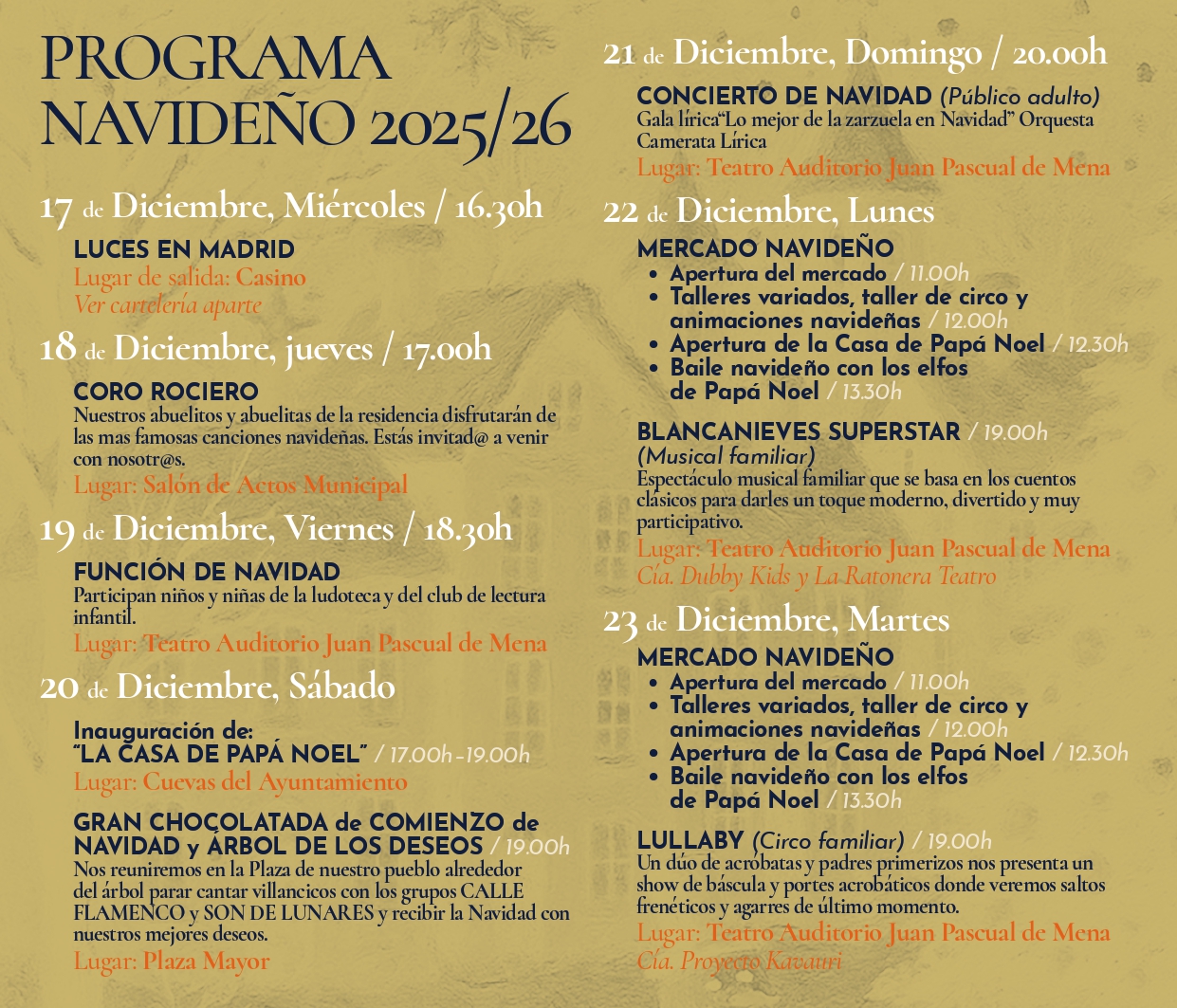 Nuestro municipio ya tiene lista su programación navideña, cargada de actividades para todas las edades: conciertos, teatro, circo, excursiones, talleres infantiles, chocolatadas, espectáculos musicales, Navilandia y, por supuesto… ¡la esperada Cabalgata de Reyes!