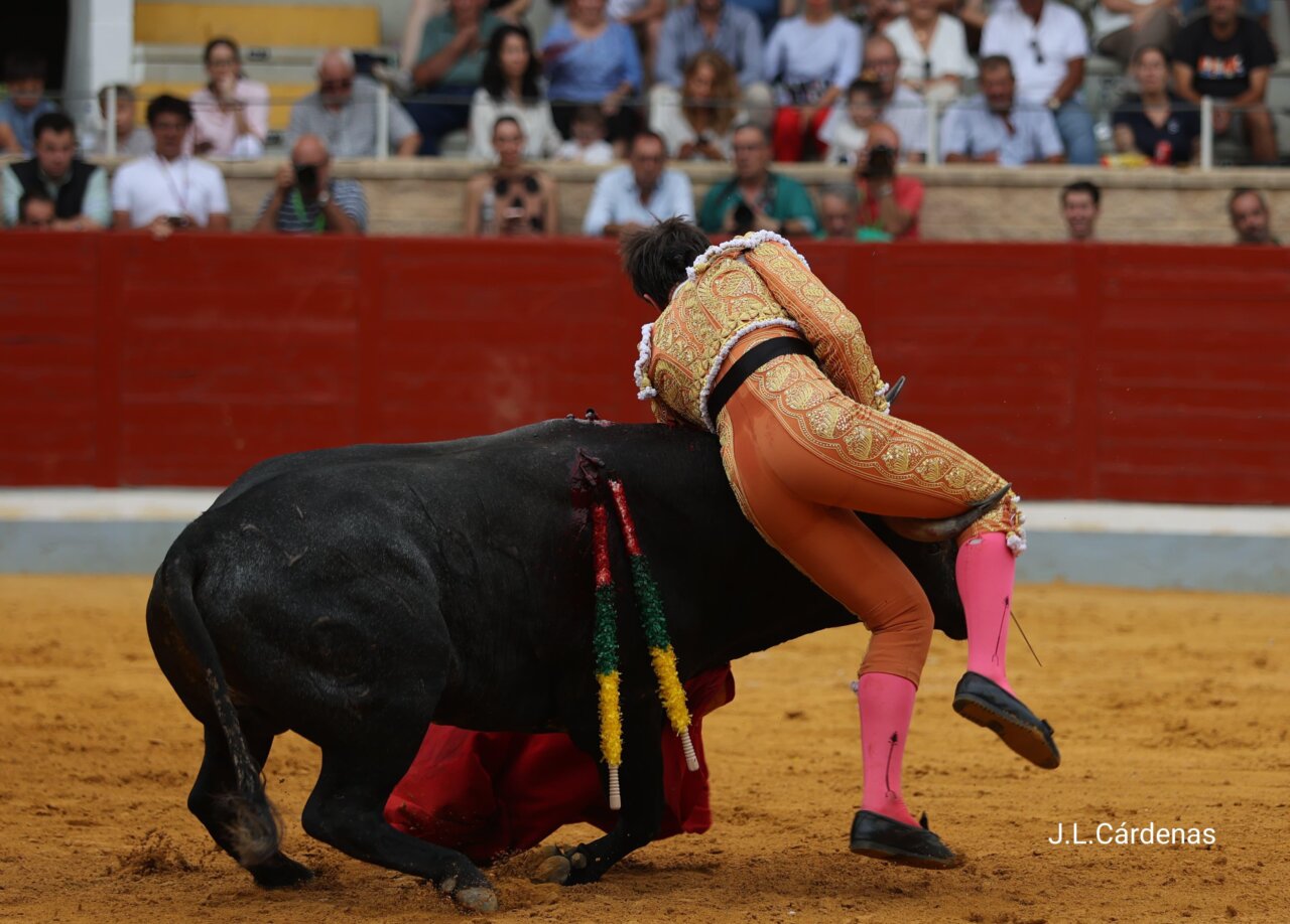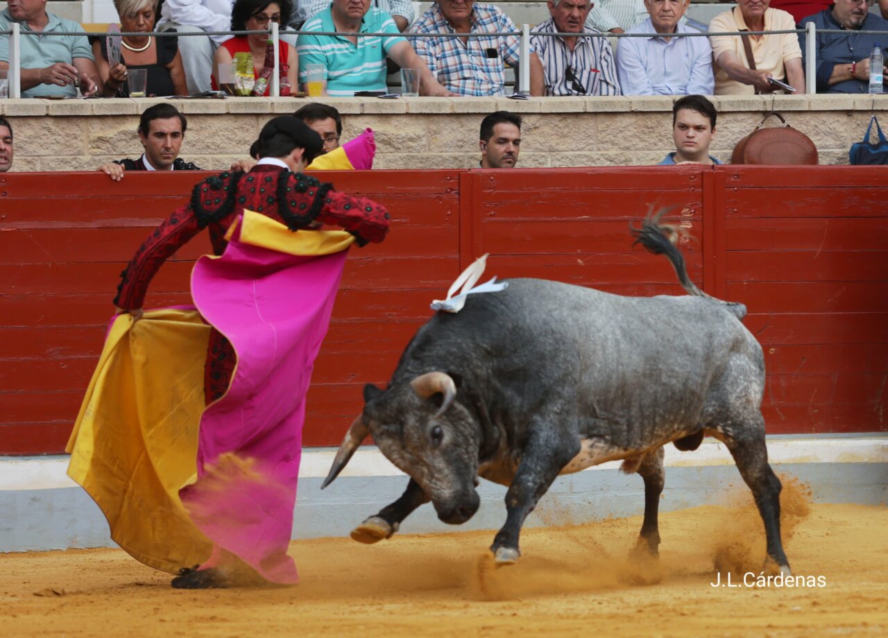 Para Cristiano Torres fue el segundo, «Barrenero» número 64, negro bragado meano, más fino y que abría la cara, humillador y con poco gas de salida. Lo paró Torres con oficio. Echó la cara arriba sin emplearse en varas, humillando al final. Luego fue de largo pero no se quedó en el peto en el segundo encuentro. Sin sangrar absolutamente nada el utrero se cambió el tercio. Cortó en banderillas y se metió por dentro en la brega. A Alberto Carrero le puso los pitones en el pecho en su par y «Venturita» dejó los cuatro palos con oficio. Tras el emotivo brindis a un niño discapacitado, comenzó faena y enseguida se vio que el novillo no tenía recorrido, aún humillando. Firme el novillero aragonés que logró alargar las embestidas del burel por el izquierdo, embestida rebrincada y a la defensiva. Le hizo las cosas muy bien y fue sacando naturales de mérito, con temple y largura. Sacó fondo el de Ana Romero y la faena tomó vuelo. Y en esas llegó la voltereta, cuando en un pase de pecho el novillero se descubrió. Tras el susto, de puso de nuevo Cristiano Torres como si nada. Lastima que, con la espada, cambió la oreja por el aviso.