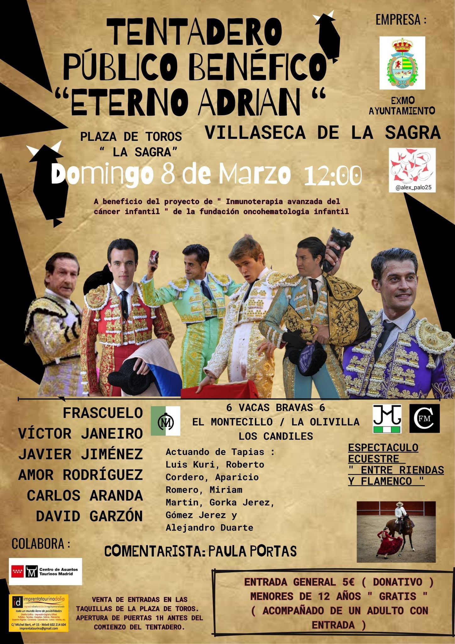 Villaseca de la Sagra volverá a unir tauromaquia, cultura y solidaridad el próximo domingo 8 de marzo de 2026 con la celebración del Tentadero Benéfico y Gala “Eterno Adrián”, una iniciativa a favor de la investigación contra el cáncer infantil que reafirma el compromiso del municipio con las causas que verdaderamente importan.