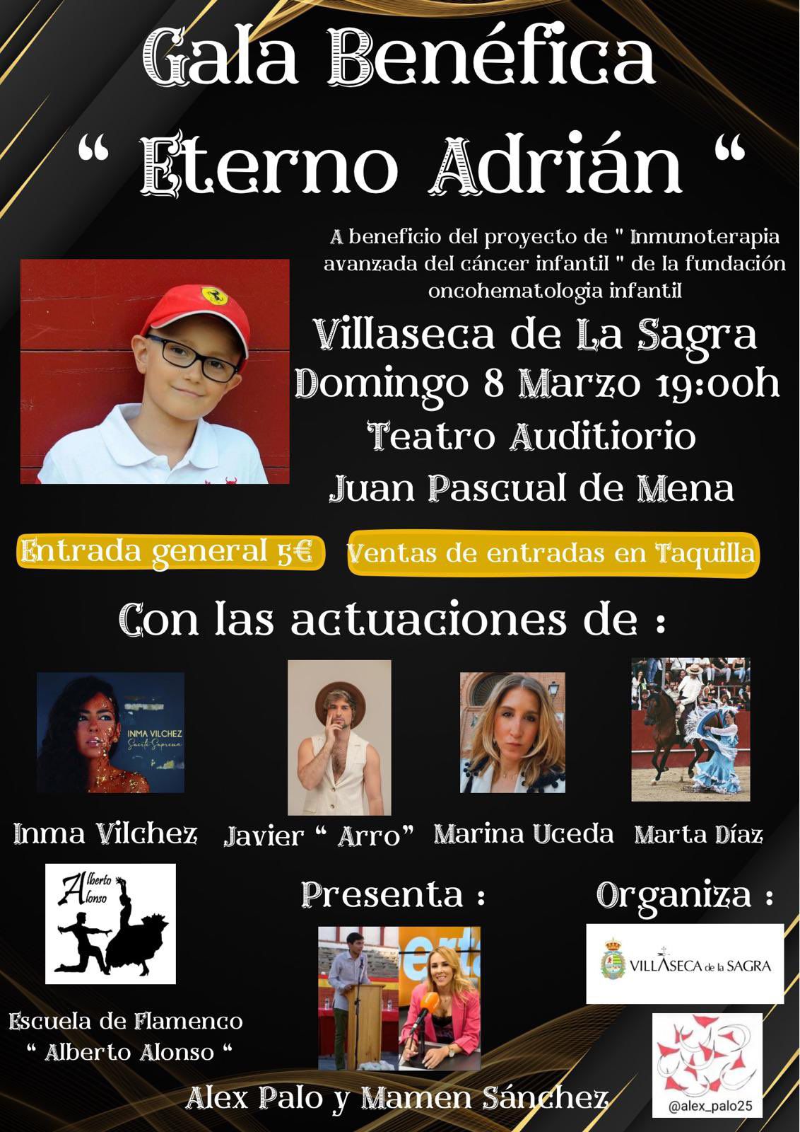 Ya por la tarde, a las 19:00 horas, el Auditorio Juan Pascual de Mena acogerá la Gala Benéfica “Eterno Adrián”, un acto cargado de emoción y arte que reunirá sobre el escenario a Inma Vílchez, Javier “Arro”, María Uceda, Marta Díaz y la Escuela de Flamenco “Alberto Alonso”. La gala estará presentada por Álex Polo y “Mamen” Sánchez, y las entradas podrán adquirirse en la taquilla del auditorio al precio de 5 euros.