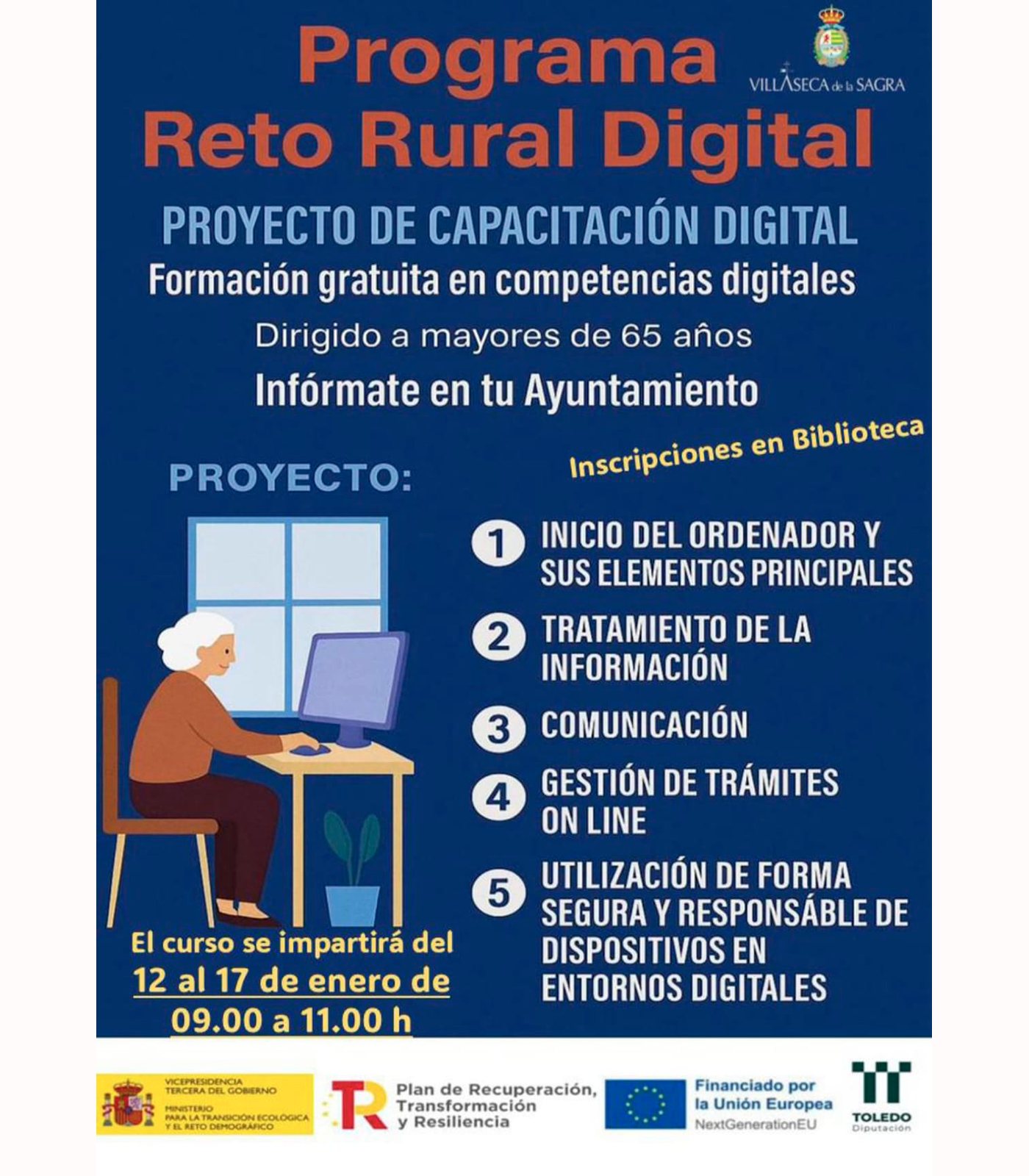 Villaseca de la Sagra acoge el Programa Reto Rural Digital, un curso gratuito de capacitación digital que se impartirá del 12 al 17 de enero, de 09:00 a 11:00 h.