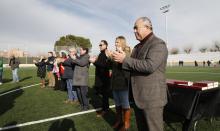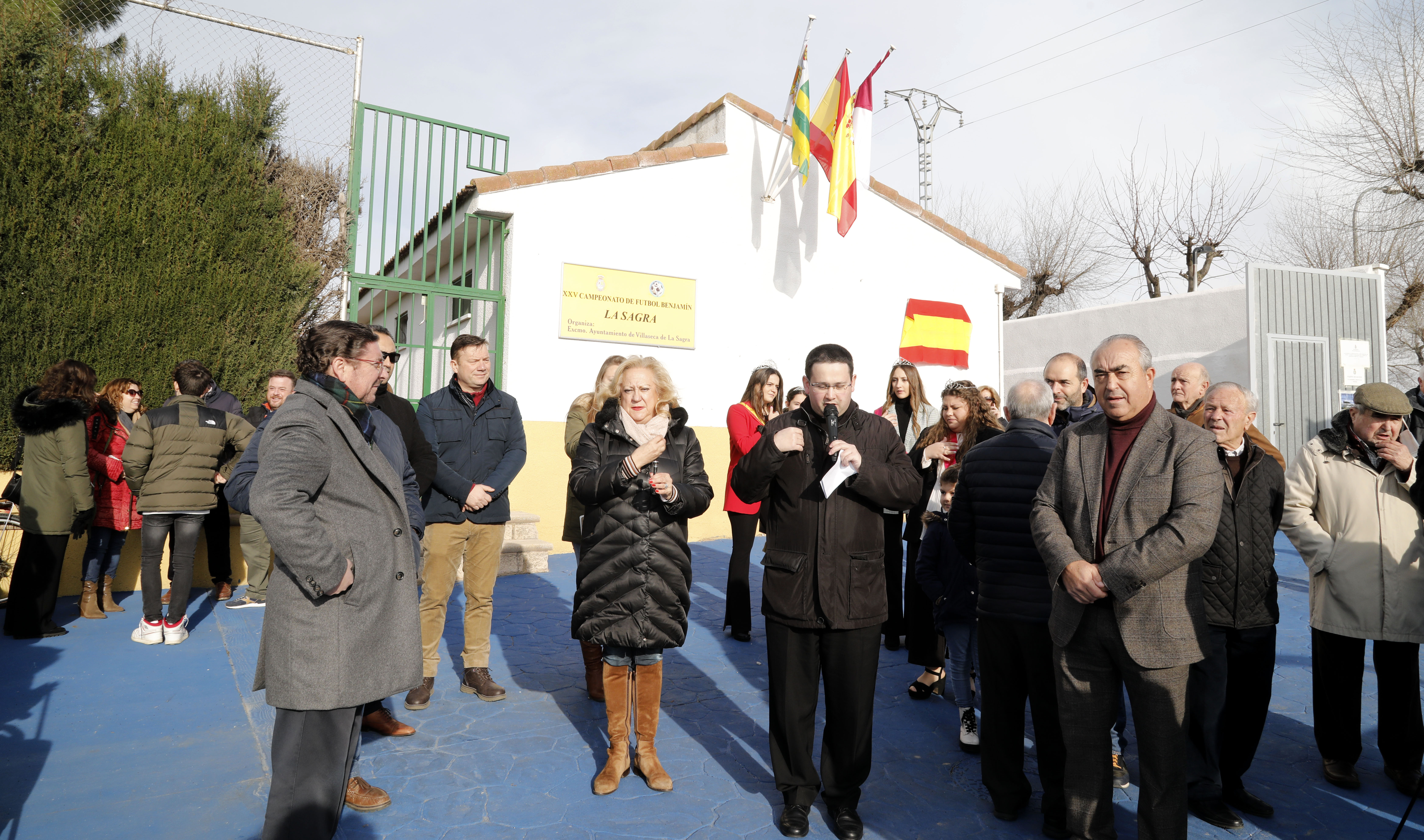 El alcalde, Jesús Hijosa Lucas junto a los miembros del equipo de gobierno del Ayuntamiento de Villaseca de la Sagra han presidido el acto de inauguración de las nuevas instalaciones del remozado Campo Municipal de Fútbol “El Prado” descubriendo la placa en la que quedará grabado el histórico acontecimiento para el desarrollo de la promoción deportiva de la localidad.
