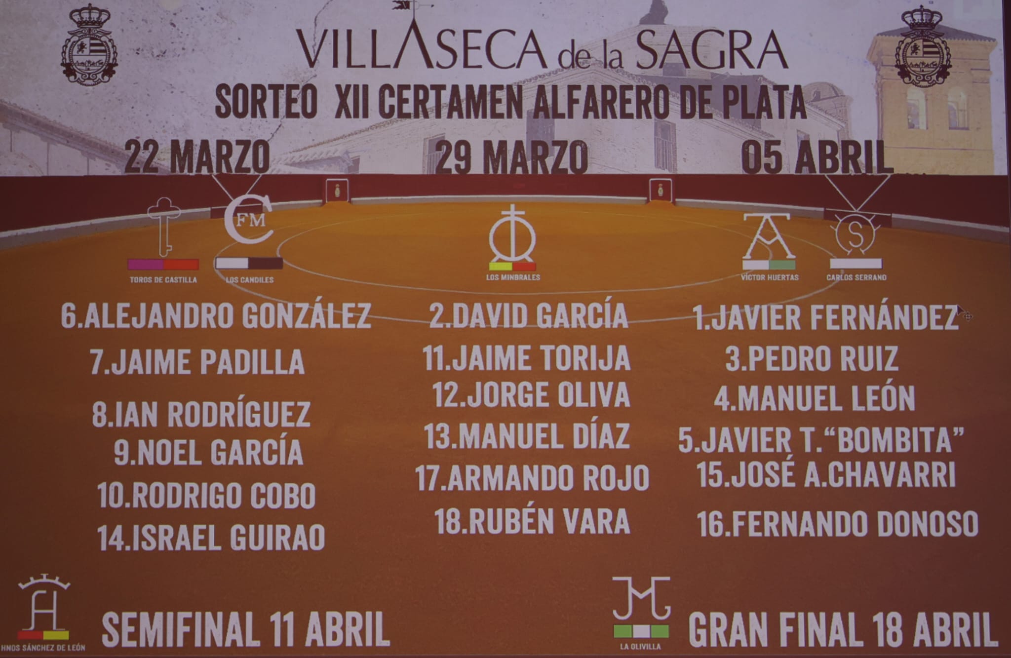 Tras la charla-coloquio tuvo lugar uno de los momentos más esperados de la jornada: el sorteo oficial de las tres novilladas clasificatorias del XII Alfarero de Plata 2026, certamen fundamental en la promoción de jóvenes valores.